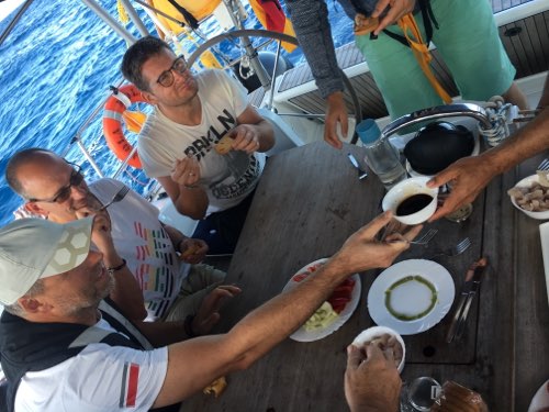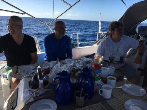 So sieht Frühstücken mitten auf dem Atlantik aus. Das 2. Bild ist Sashimi von unserer gestern gefangenen Goldmakrele (Mahi Mahi) als kleiner Nachmittags Snack.
