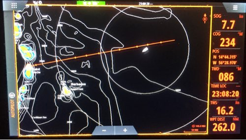 Stand gerade eben haben wir noch 242 sm zu segeln bis zur Ziellinie (siehe Chart Plotter Bild)
