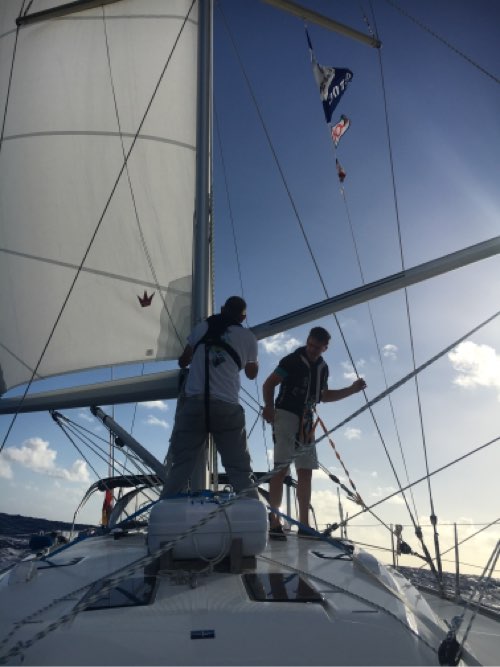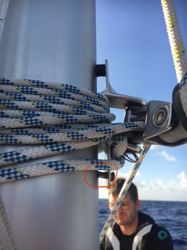 Torsten und Roman, welche meist die Arbeiten am Vorschiff erledigen, haben mit einer speziellen Leinen Konstruktion die Last umgelenkt, so dass die Halterung bei der sich die Niete löst noch bis St. Lucia durchhalten müsste. Wirklich eine Super Leistung!