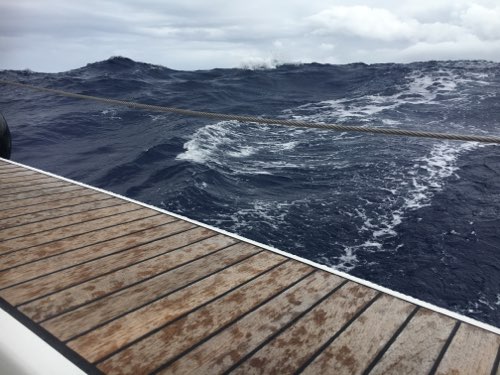 Da ich ja auch etwas Erfahrung mit dem Hantieren der Segel sammeln möchte, bin ich gelegentlich am Vorschiff mit dabei, wie heute Morgen. Bei ca. 3m Wellengang wie heute ist das ein interessantes aber kein ungewöhnliches Manöver. Spannend wird es erst, wenn es mitten im Manöver beginnt extrem zu regnen, dann kommt man wie ein im Wasser getränkter Hund, nass bis zur Unterhose, zurück. Hätte ich doch nur gleich das Shampoo mit nach vorne genommen…