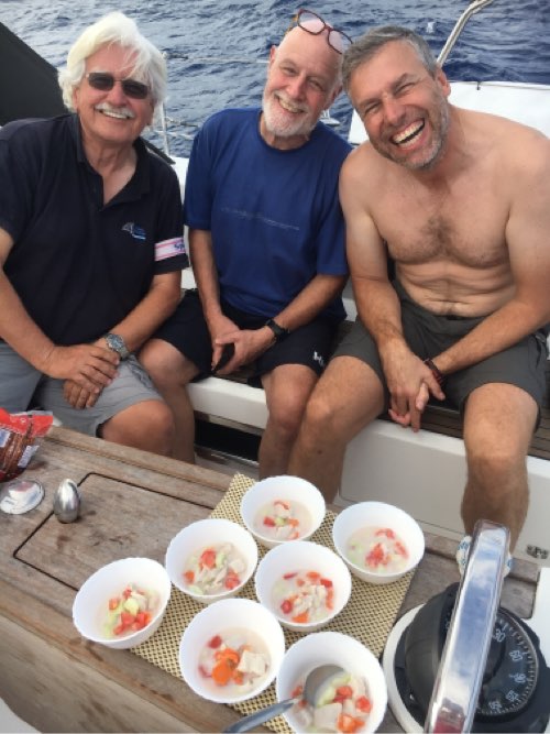 Andrea, anAustrianGirl, hatte mir heute Morgen ein Rezept für Ika Mata oder Poisson Cru (Tahiti Style) per E-Mail geschickt, welches ich am Nachmittag als kleinen Snack gleich ausprobierte. Dabei handelt es sich um eine Art leckeren Salat mit rohen Fisch, welchen wir häufig bei unserer Südsee Reise von den Cooks bis zu Französisch Polynesien gegessen hatten. Die Crew war sehr begeistert!