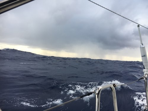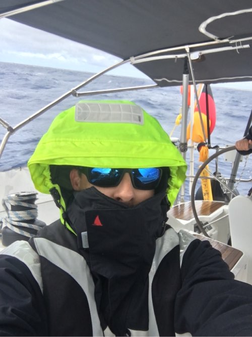 Für meine Tagwache war ich dank der Offshore Jacke, welche mir Helena für die Atlantik Überquerung geliehen hat, gut vor dem Regen geschützt.