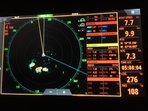 Heute Früh in der Nachtwache, haben wir unseren ersten Squall auf dem Radar gesehen. Dieser war jedoch so klein, dass wir nicht einmal die Segel refften. Mit vollem Segel durch den Squall, es wurde ein bisschen nass und der Wind hat nur um ca. 7 kn zugenommen. Da wir ohnehin nur ca. 15 kn Wind haben war das nicht so tragisch.