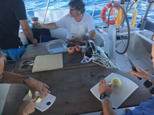 Wir haben nun nach fast einer Woche schon eine gute Routine. Segel setzen und bergen (Spinnaker), Boot Reinigung und kochen. Alles funktioniert sehr gut und es kommen bis jetzt immer leckere Gerichte dabei raus.