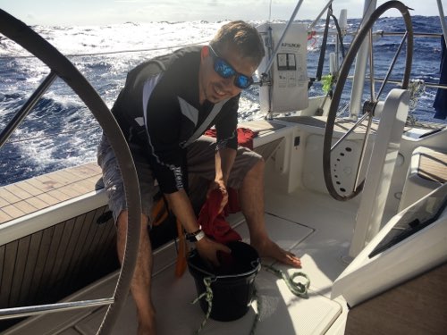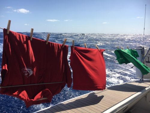 Stattdessen wird die Wäsche im Eimer gewaschen und an der Reling zum Trocknen befestigt.