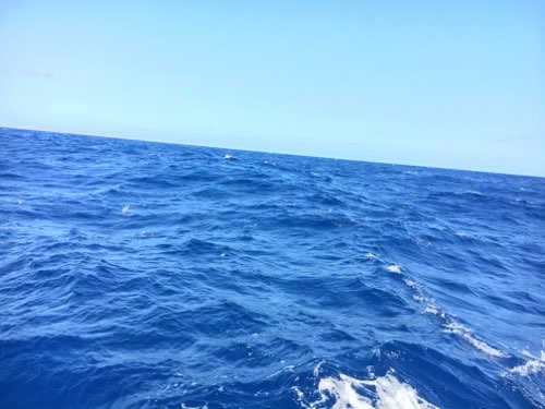 Fliegende Fische zu Fotografieren ist nicht ganz einfach. Plötzlich tauchen Scharen von Fischen aus dem Wasser, meist so 10-20 Stück, und segeln einige Meter über das Wasser zwischen den Wellen Bergen. Dann ist wieder für einige Zeit Ruhe. Bis man eine Kamera holt und diese aufnahmebereit ist, ist das Naturschauspiel vorbei. Mit blau schimmernden, schnell schlagenden Flügel gleiten sie dahin. Mit etwas Glück konnte ich heute ein paar erwischen, ob man diese auf den für die Satelliten Übertragung verkleinerten Bilder noch erkennen kann, weiß ich nicht. In dem blauen Wasser Bild sind zwei, drei Fische zu erkennen.